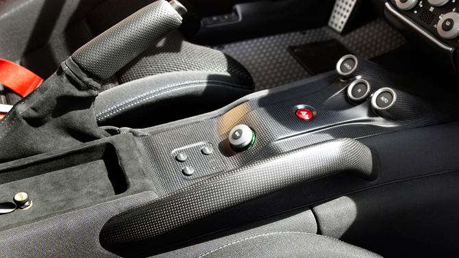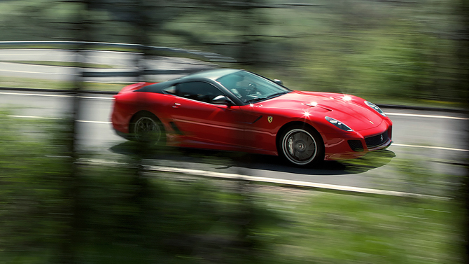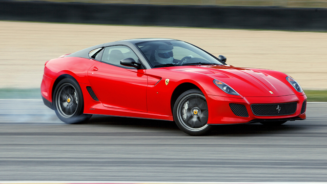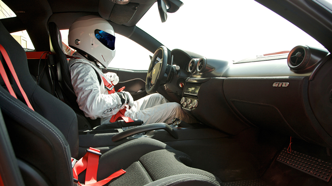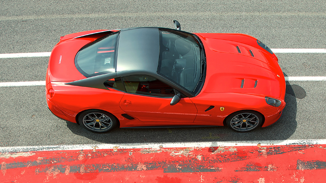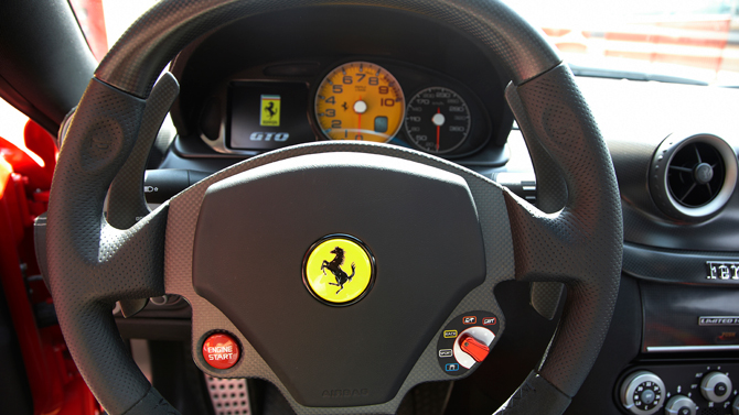 Auto je ihned přívětivé a utěšující. Miluju 599. Je to pořádné auto na zadní pohon s motorem vpředu a je velké, spousta místa uvnitř. Krásný volant doplněný červeným startovacím tlačítkem a pětistupňovým přepínačem „manettino“, dokonale nastavitelným na dosah. Přitáhnu si ho, nastavím nettino na „závod", což znamená hlasitější odsávání, tvrdší tlumiče a ideální skluz u kontroly trakce.