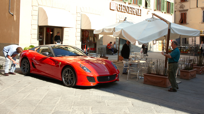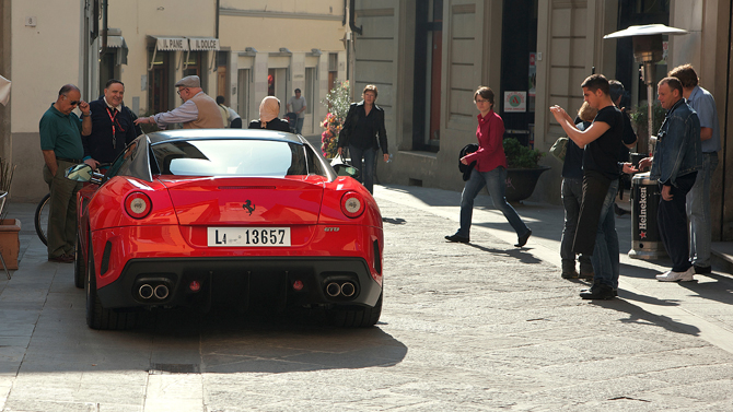 Najednou se ze vzdálené garáže a bez varování objevil Stig. Když natáhnul ruku v rukavici pro klíče, cítil jsem slabé aroma borovice a divokého rozmarýnu. Vzal si GTO a zatřásl s ním drsným jedním z nejdelších nejhlučnějších nejšílenějších driftů, co jsem kdy viděl. ESP vypnuto… no jasně. Za křiku V12 při omezovači a vytí pneumatik šlo vidět jeho zuřivé ruce pracující na volantu v dokonalém sjednocení s jeho pravou nohou. Po jízdě neřekl vůbec nic, jen vyskočil a odkráčel směrem k Poggiforzoli*. Ale jak je vidno z fotek, líbilo se mu to. Hodně.